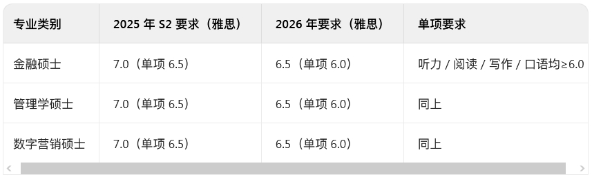 數字營銷、金融、管理學等專業 2025 年秋季入學仍按原標準執行,建議申請者優先沖刺語言成績或考慮配讀語言班。