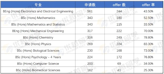 不過熱門專業差異明顯:商業管理專業申請 626 人,僅 100 人錄取(15.97%);但也有offer率是很友好的,以電子工程專業為例,有317人申請,其中267人收到offer,offer率高達84.23%。
