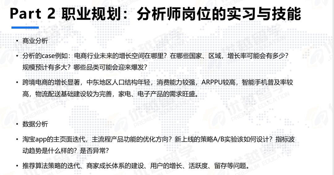 所以大家可以看到,商業(yè)分析和數(shù)據(jù)分析這兩類不同崗位,在準(zhǔn)備的時候需要找對應(yīng)的實習(xí)。比如學(xué)經(jīng)濟(jì)學(xué)的同學(xué)未來想去做商業(yè)分析師,就應(yīng)該找一些分析行業(yè)案例的商業(yè)分析崗位實習(xí);如果想做數(shù)據(jù)分析師,就重點關(guān)注那些能參與公司產(chǎn)品策略復(fù)盤、決策甚至指標(biāo)分析的實習(xí)機會,這樣的實習(xí)對未來申請目標(biāo)崗位會有很大幫助。