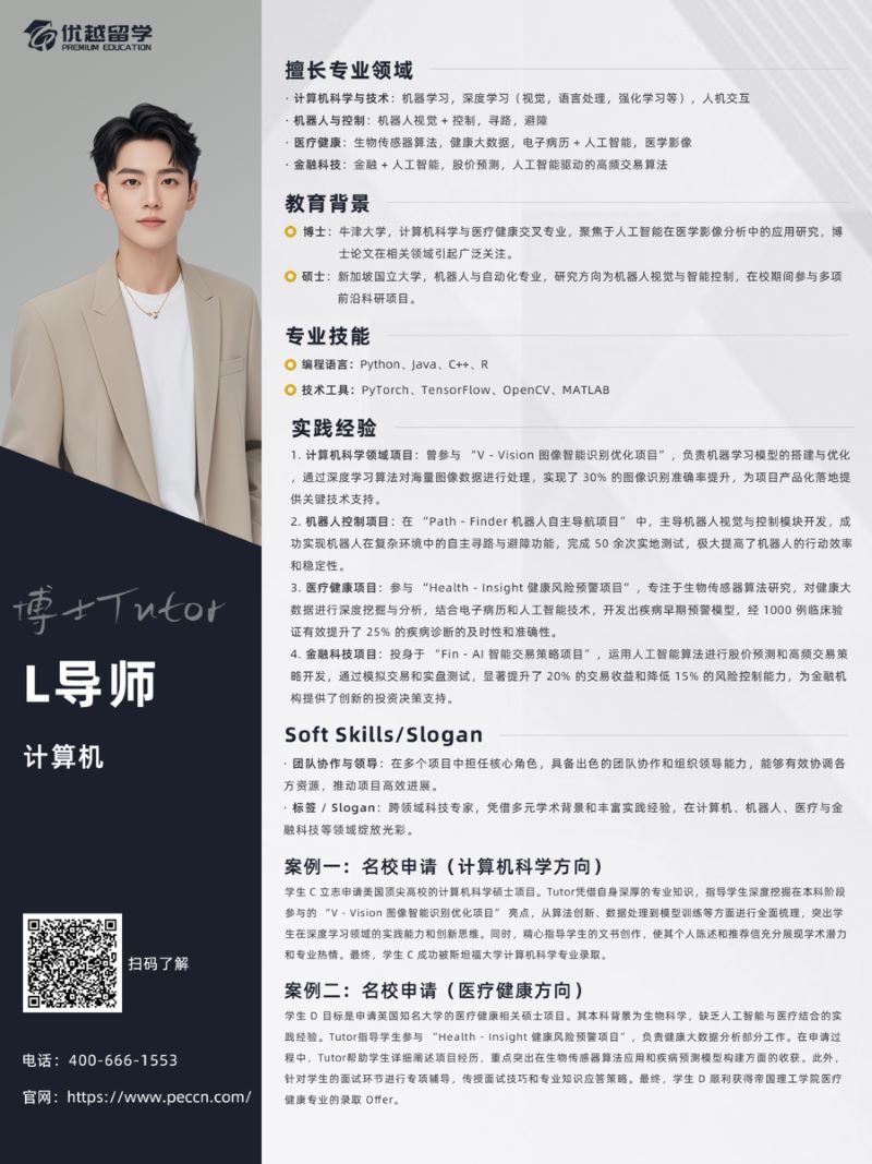 輔導方法:熟悉牛劍招生偏好,幫助學生在簡歷中突出科研成果的量化指標(如 mDice、AUC),并提供劍橋課程與導師研究動態(tài)的內(nèi)部信息,避免申請誤區(qū)。