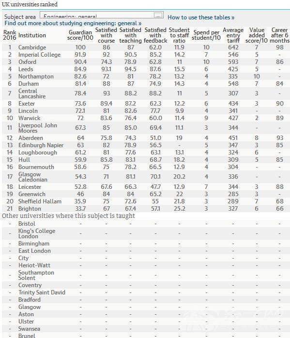2016《衛報》英國大學普通工程學專業排名--優越教育
