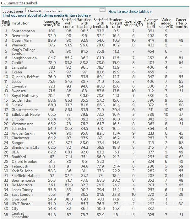 媒體與電影研究專(zhuān)業(yè)的排名如下: