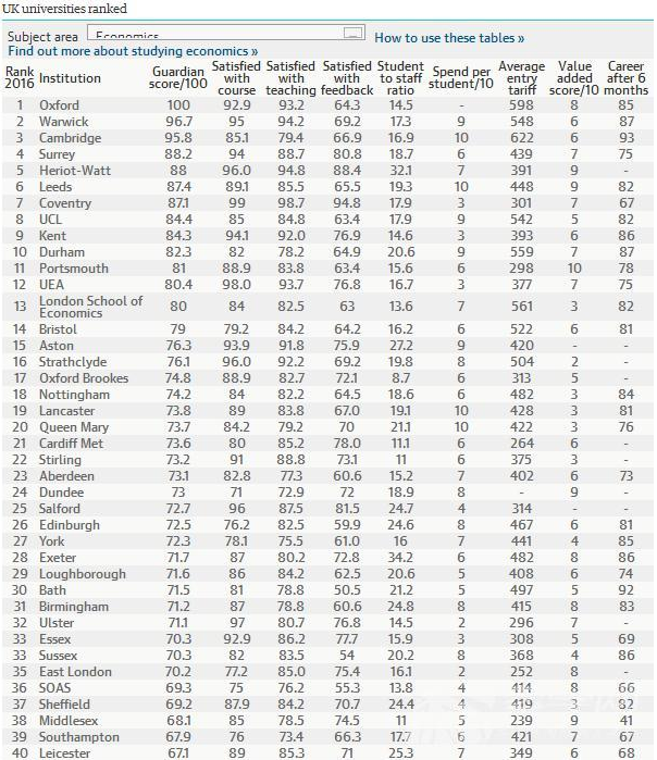 2016《衛(wèi)報(bào)》英國(guó)大學(xué)經(jīng)濟(jì)學(xué)專(zhuān)業(yè)排名--優(yōu)越教育