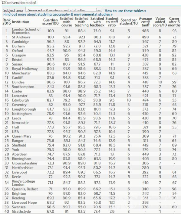 2016《衛報》英國大學地理及環境研究專業排名--優越教育