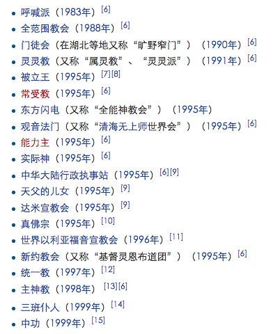 由于新教大大小小的教派繁多,因此里面不免魚(yú)龍混雜。很多教義扭曲的邪教也混跡在其中,譬如去年國(guó)內(nèi)招遠(yuǎn)慘案中的全能神教也是自稱是信奉新教教義的基督教。微博賬號(hào)央視評(píng)論員曾經(jīng)發(fā)過(guò)一個(gè)帖子教育大家怎么樣辨別邪教。主要是以下這幾條:“邪教具有強(qiáng)烈的排他性,始終宣傳自己是最偉大的;邪教具有強(qiáng)烈的強(qiáng)迫性,通過(guò)洗腦和自我標(biāo)榜來(lái)確立自己的正確性;邪教具有通過(guò)壓迫別人來(lái)獲得利益的特性;邪教內(nèi)部通過(guò)裙帶和其他手段來(lái)構(gòu)筑內(nèi)部關(guān)系網(wǎng),以保證其利益;邪教往往嘴上說(shuō)的很好,實(shí)際上做著最齷齪的事情”。在2005年中國(guó)公安部發(fā)布的《中華人民共和國(guó)公安部關(guān)于認(rèn)定和取締邪教組織若干問(wèn)題的通知》中認(rèn)定和明確了14中邪教組織。下圖是國(guó)內(nèi)這14個(gè)邪教組織的名單(來(lái)源:維基百科):