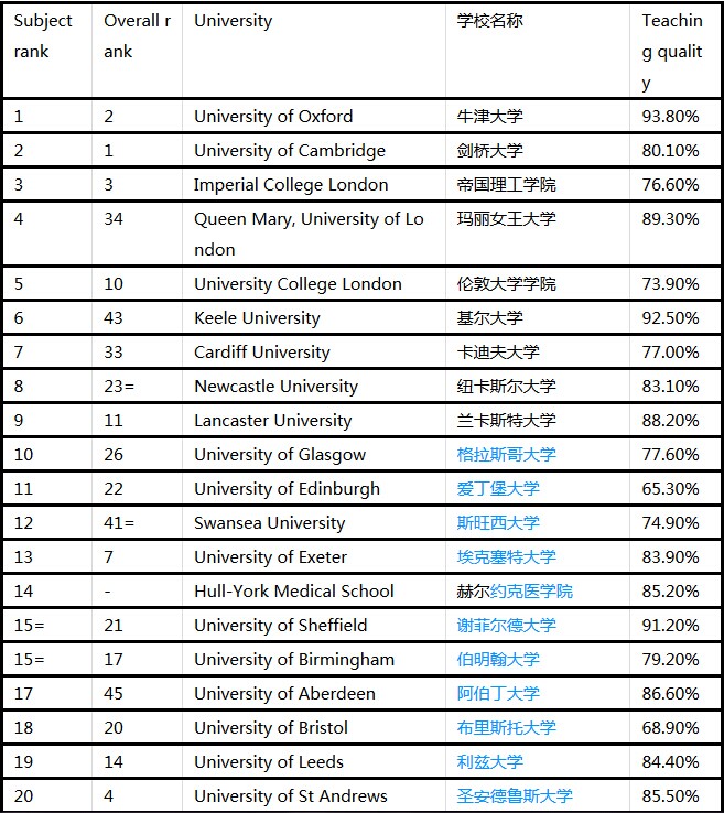 當前位置 :英國留學->英國大學排名信息->2016年TIMES英國大學醫(yī)學專業(yè)排名