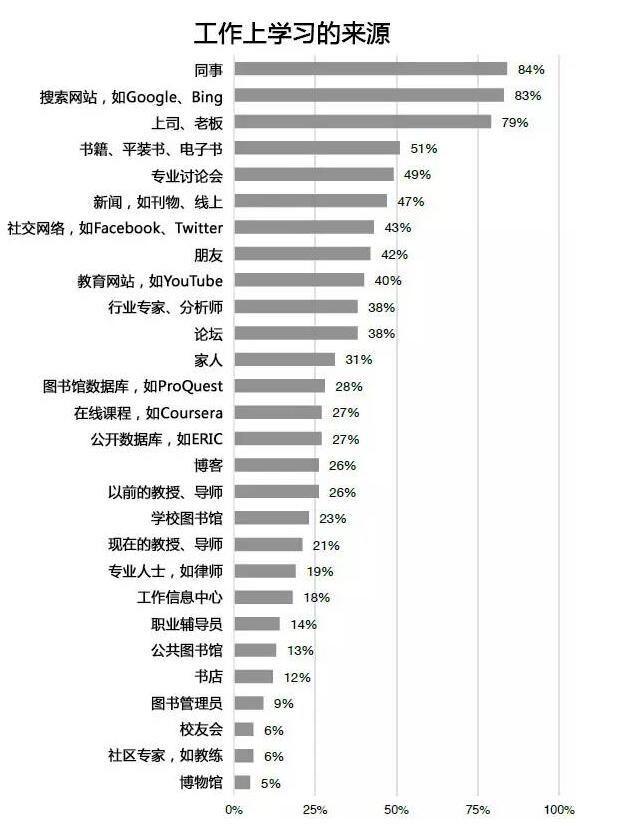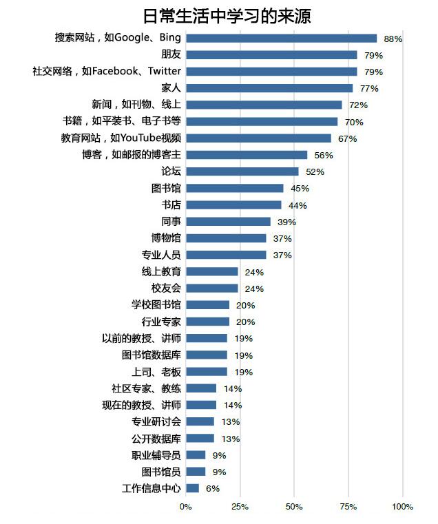 美國大學生在生活和學習上是怎么樣實現自我增值的呢?華盛頓大學信息素養項目(PIL)的研究通過來自10所大學的1651份調查問卷總結告訴我們,美國大學畢業生主要也是靠搜索引擎、社交媒體和親朋好友來獲取學習信息;