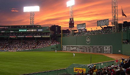 ??芬威球場(Fenway Park)是一片神圣的土地。這里的座位十分接近賽場,以至于觀眾可以聽到棒球的擊球聲在這個有102年歷史的棒球場上保持了很多傳統:記分板仍然由手工操作;37英尺長的有“綠色怪物”之稱的左外野全壘打墻困擾了投球手整整七十年;排隊買芬威弗蘭克熱狗就像給洋基隊喝倒彩、用Sharpie標記右外野方向的界外標桿那樣成為了傳統的一部分。