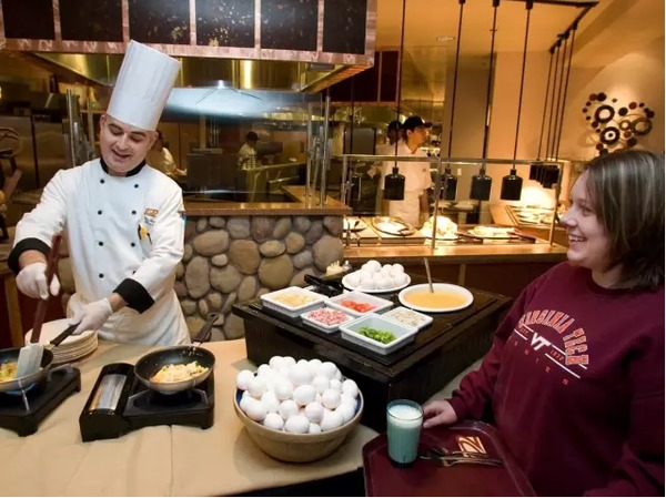 在Hokies餐廳還可以享受到每日限定的牛排和龍蝦!除了這一家高端餐廳,受歡迎的當屬西段市場,學生可以一邊吃著現烤披薩和特制漢堡,一邊在運動休息室觀看背投電視。
