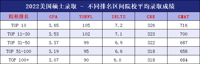 從錄取數(shù)據(jù)來(lái)看,高GPA、托福和GRE成績(jī)的學(xué)生在申請(qǐng)中依舊占據(jù)明顯優(yōu)勢(shì)。以下是2022年美國(guó)不同排名區(qū)間院校在碩士研究生錄取時(shí),對(duì)學(xué)生各項(xiàng)成績(jī)的平均要求: