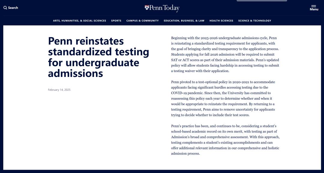 最近,美國(guó)各大學(xué)的 ED2 錄取結(jié)果陸續(xù)公布,就在這個(gè)時(shí)候,賓夕法尼亞大學(xué)放出了一個(gè)重磅消息。2 月 14 日,賓大通過《賓大日?qǐng)?bào)》發(fā)布通知:從 2025 - 2026 年本科招生周期開始,也就是 2026 年秋季入學(xué)的申請(qǐng)季(2026Fall),賓大將恢復(fù)對(duì)美國(guó)本科留學(xué)申請(qǐng)者的標(biāo)準(zhǔn)化考試要求。