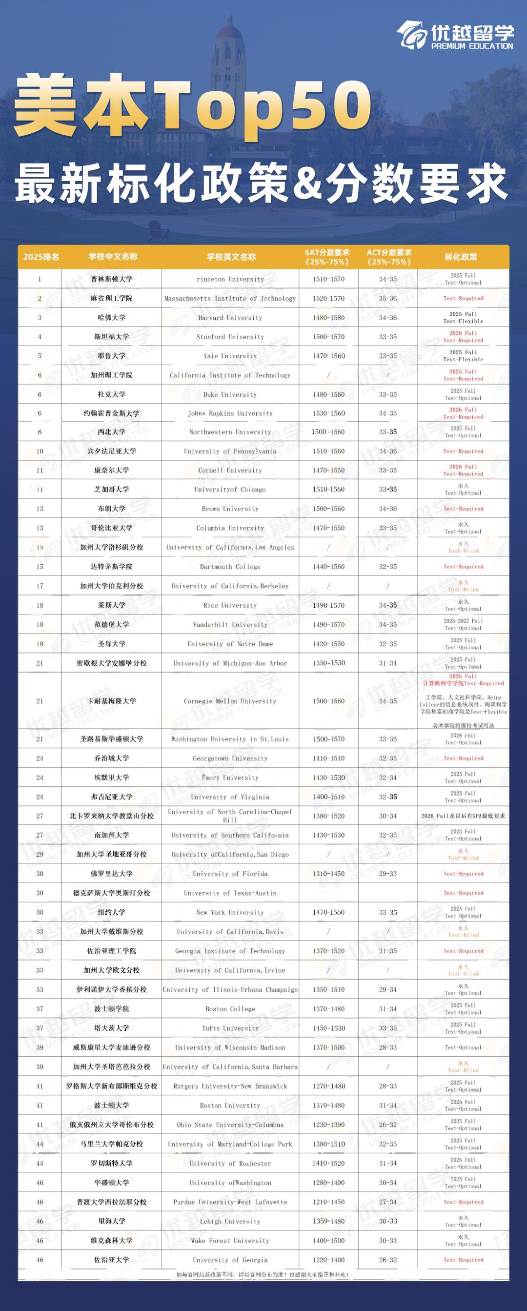 就目前來看,8所藤校中,除了哥倫比亞大學(xué)是永久可選,普林斯頓大學(xué)暫未更新26Fall招生政策,其他6所藤校都已經(jīng)要求申請(qǐng)人提交標(biāo)化成績(jī)。而且,不同學(xué)校的標(biāo)化政策和分?jǐn)?shù)要求差異不小。優(yōu)越君給大家整理了美國(guó)top50院校已經(jīng)錄取公布了其最新標(biāo)化政策及分?jǐn)?shù)要求,詳情可見??