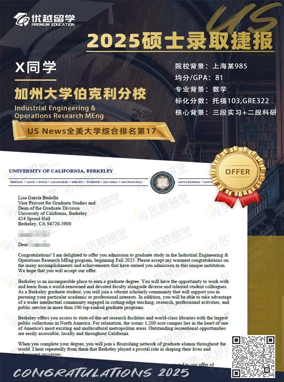 以上是【【美國碩士】985法學生實習經歷豐富,上岸加州大學伯克利分校法學LLM】相關的全部內容,查看更多【美國碩士錄取】相關資訊可前往【優(yōu)越留學】首頁!詳細申請規(guī)劃及方案定制請預約優(yōu)越留學顧問為你一對一解答!