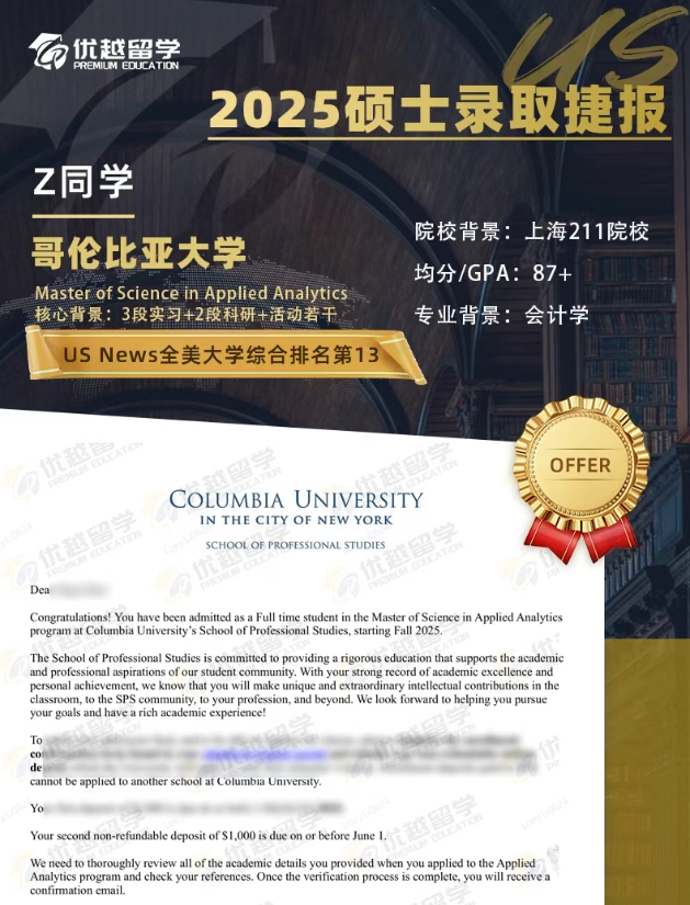25fall重磅offer來襲!恭喜優越學員在2025fall順利斬獲美國top30名校哥倫比亞大學錄取,一起來看看offer詳情吧!